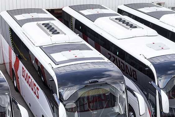 Auch in unserem bestehenden Fuhrpark setzen wir gemeinsam mit unserem Partner Green Energy auf innovative Technologien mit messbarem Nutzen. o wird unsere Busflotte schrittweise mit Solarpaneelen auf den Busdächern ausgestattet, die die Effizienz im laufenden Betrieb nachweislich verbessern.
